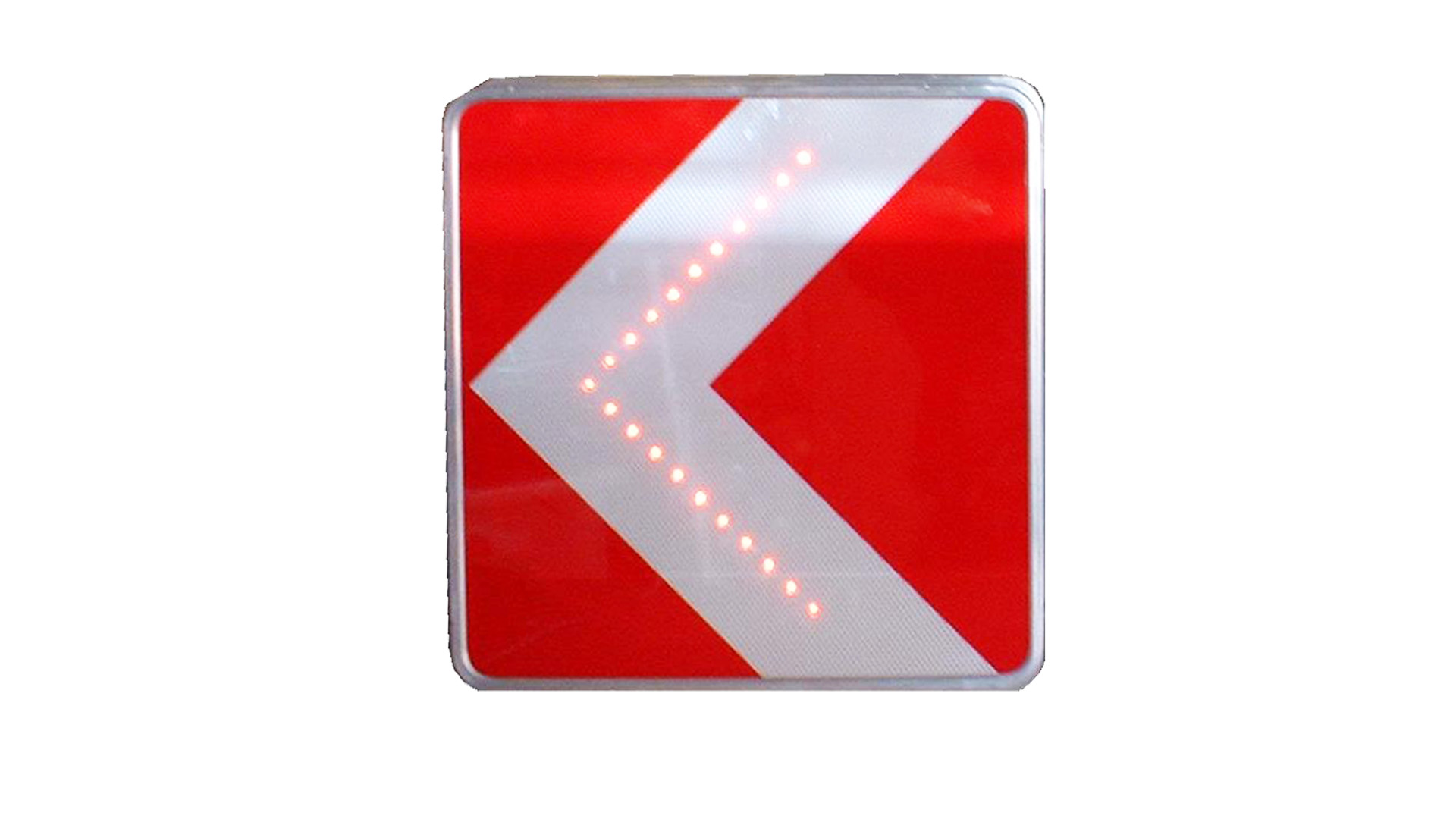 Verkehrszeichen bestückt mit roten LEDs am Rand. Das Verkehrszeichen ist auffälliger und wird somit leichter wahrgenommen. Die verwendete LED-Technik sorgt für eine hohe Lebensdauer und einen geringen Stromverbrauch. Nahezu jedes Verkehrszeichen § 50 und § 52 sowie Leitwinkel sind möglich.