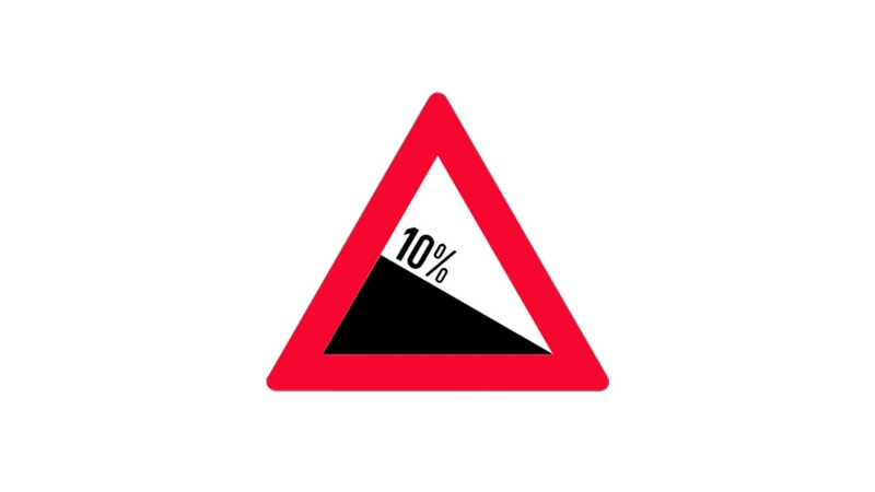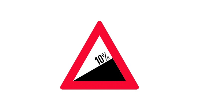 Dieses Zeichen kündigt eine starke Steigung der Straße an. Die Steigung ist in Prozenten anzugeben und hat sich auf den steilsten Teil der Strecke zu beziehen.
