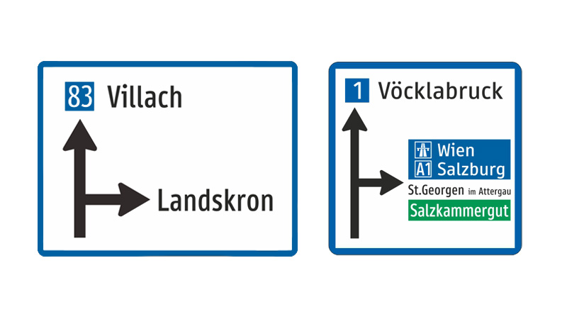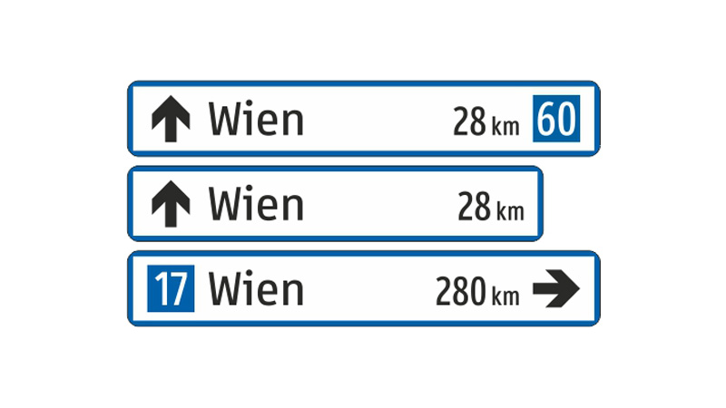 Diese Zeichen zeigen im Bereich einer Kreuzung die Richtung an, in der ein Ort liegt. Sie dürfen auch nur auf der linken Straßenseite angebracht werden, wenn dies eine bessere Erkennbarkeit erwarten läßt. Auf den Zeichen können auch die Namen mehrerer Orte sowie die Entfernungen, die Straßennummern, Symbole und allenfalls Hinweise auf Beschränkungen angegeben werden. Ist auf einem solchen Zeichen ein Symbol für eine bestimmte Fahrzeugart angebracht, so bedeutet dies, dass der Wegweiser nur für Fahrzeuge der betreffenden Fahrzeugart gilt.