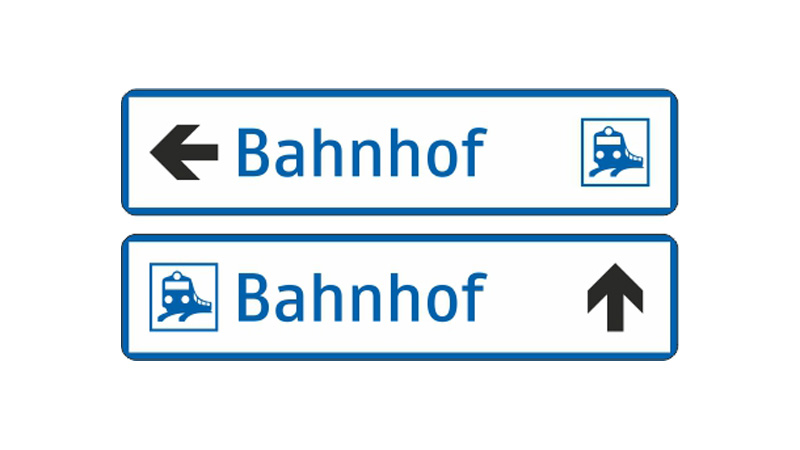 Dieses Zeichen zeigt im Bereich einer Kreuzung die Richtung an, in der Einrichtungen anderer Verkehrsträger, ausgenommen Seilbahnen und Lifte, liegen. Es darf auch nur auf der linken Straßenseite angebracht werden, wenn dies eine bessere Erkennbarkeit erwarten läßt. Auf dem Zeichen können auch Symbole und Entfernungen angegeben werden.