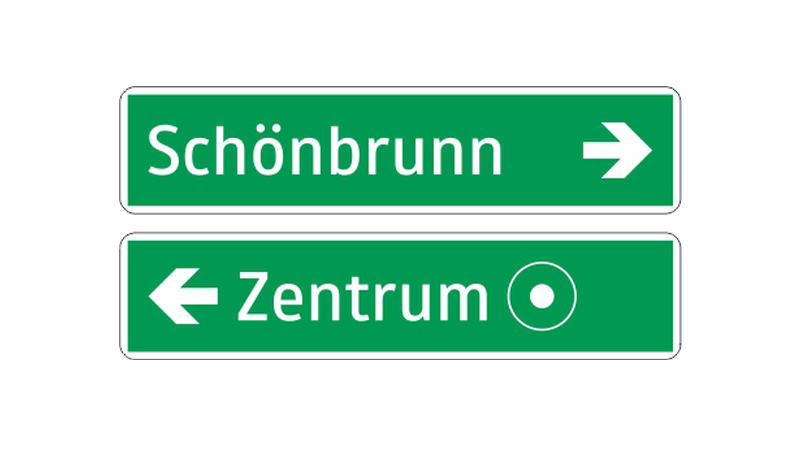 Diese Zeichen zeigen im Bereich einer Kreuzung die Richtung an, in der bedeutende Ziele innerhalb eines Ortsgebietes oder Gebiets- oder Landschaftsziele liegen. Ein Zeichen dieser Art und Ausführung ist auch zu verwenden, wenn die Richtung zu Seilbahnen und Liften angezeigt wird. Diese Zeichen dürfen auch nur auf der linken Straßenseite angebracht werden, wenn dies eine bessere Erkennbarkeit erwarten läßt. Auf den Zeichen können auch Symbole und Entfernungen angegeben werden. Ist auf einem solchen Zeichen ein Symbol für eine bestimmte Fahrzeugart angebracht, so bedeutet dies, dass der Wegweiser nur für Fahrzeuge der betreffenden Fahrzeugart gilt.