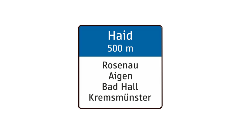 § 53/15 b StVO „AUSFAHRTSWEGWEISER - AUTOBAHN ODER AUTOSTRASSE“Diese Zeichen zeigen eine Ausfahrt aus einer Autobahn oder Autostraße an. Ein Zeichen nach a) ist am Beginn der Ausfahrt, ein Zeichen nach b) am Ende der Ausfahrt auf der linken Seite anzubringen.